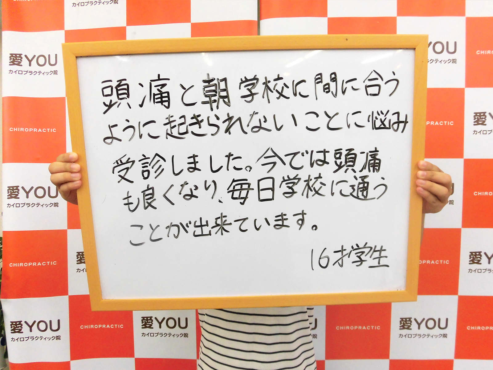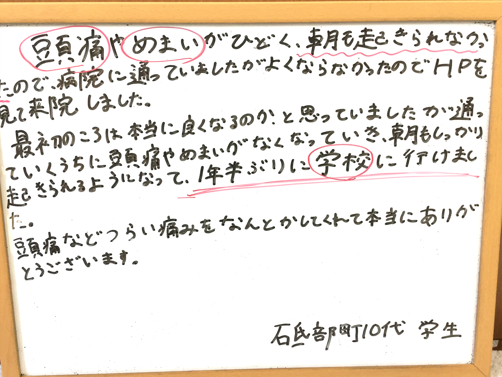 頭痛やめまいが酷く、朝も起きられなかったので病院に通っていましたがよくならなかったのでHPを見て来院しました。 最初の頃は本当に良くなるのかと思っていましたが、通っていくうちに頭痛やめまいがなくなっていき、朝もしっかり起きられるようになって、1年半ぶりに学校に行けました。頭痛など辛い痛みをなんとかしてくれて本当にありがとうございます。